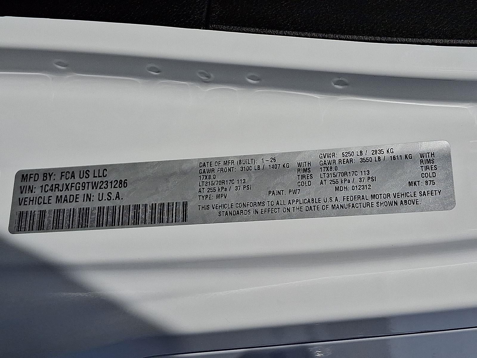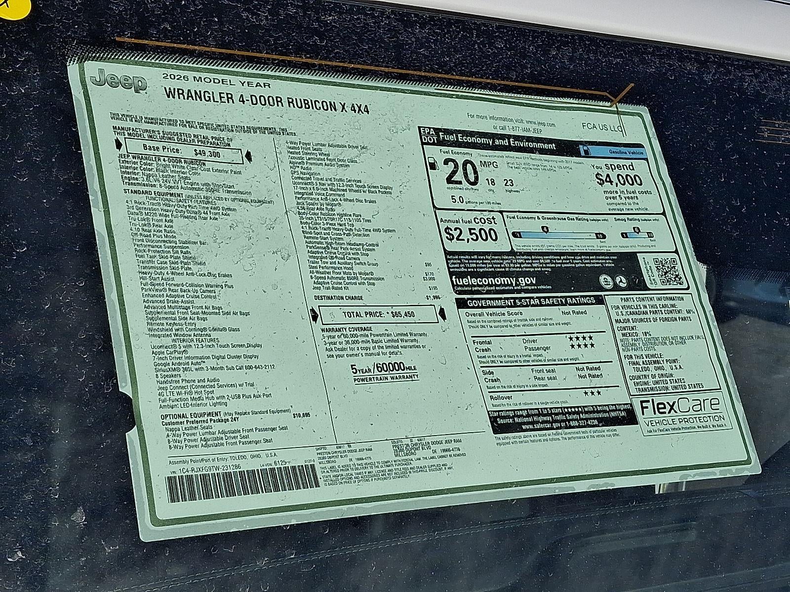 35"" TIRE SUSPENSION, 3.6L V6 24V VVT UPG I ENGINE W/ESS, 8-SPEED AUTOMATIC 850RE TRANSMISSION, QUICK ORDER PACKAGE 24Y RUBICON X, 4.56 REAR AXLE RATIO, 17"" X 8"" MACHINED WHEELS W/BLACK POCKETS, LT315/70R17C 113/110S TIRES, BRIGHT WHITE CLEARCOAT, BLACK, NAPPA LEATHER SEATS, 6,250 LBS GVWR, TRAILER TOW & AUX SWITCH GROUP, FRONT LICENSE PLATE BRACKET, STEEL PERFORMANCE HOOD PACKAGE, JEEP TRAIL RATED KIT, MOPAR ALL-WEATHER FLOOR MATS, MOPAR HINGE-GATE REINFORCEMENT