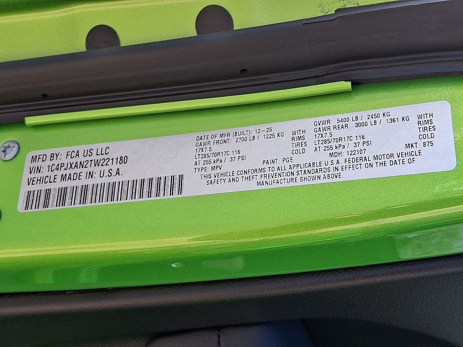 WILLY'S SUSPENSION, 2.0L I4 DOHC DI TURBO ENGINE W/ESS, 8-SPEED AUTOMATIC 850RE TRANSMISSION, QUICK ORDER PACKAGE 22W WILLYS, 4.10 REAR AXLE RATIO, 17"" X 7.5"" PAINTED BLACK WHEELS, LT285/70R17C BSW MUD TERRAIN TIRES, MOJITO CLEARCOAT, BLACK, CLOTH LOW-BACK BUCKET SEATS, 5,400 LBS GVWR, CONVENIENCE GROUP, BLACK 3-PIECE HARD TOP, JEEP TRAIL RATED KIT