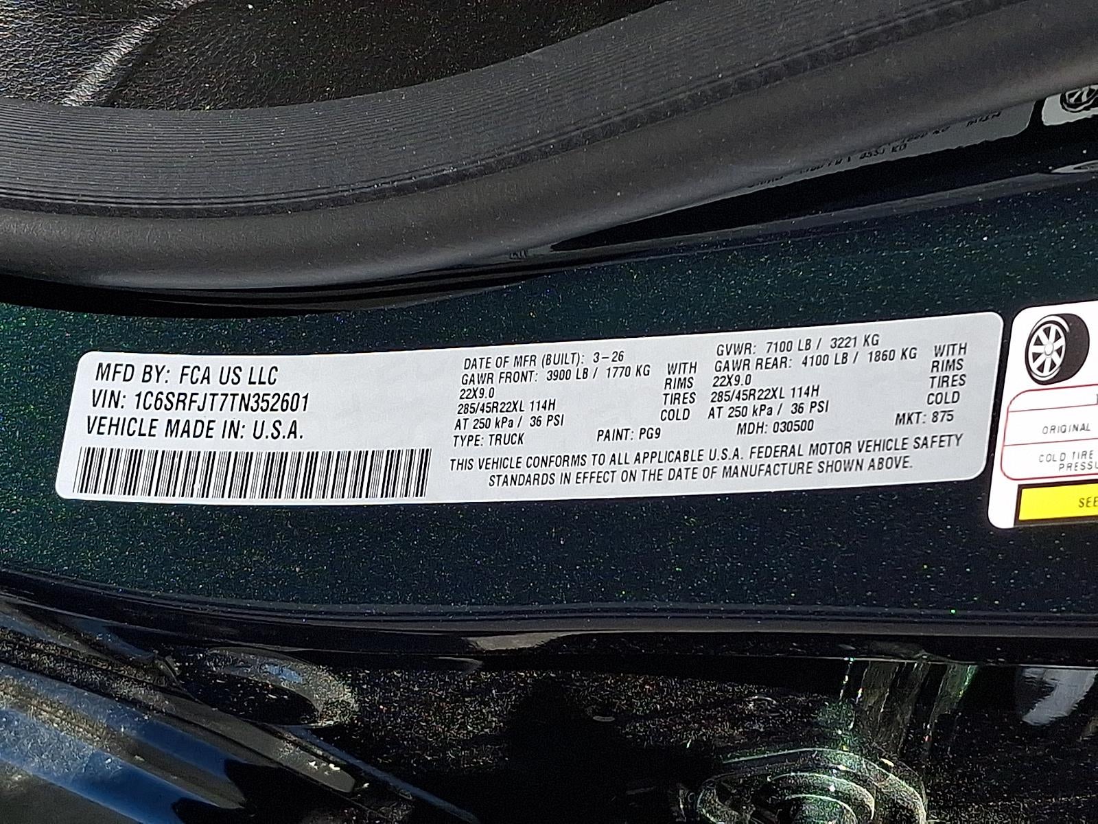 ENGINE: 5.7L V8 HEMI MDS VVT ETORQUE, TRANSMISSION: 8-SPEED AUTOMATIC (8HP75), QUICK ORDER PACKAGE 27H LARAMIE, 3.92 REAR AXLE RATIO, WHEELS: 22"" X 9"" FORGED ALUMINUM, TIRES: 285/45R22XL BSW ALL SEASON, SERRANO GREEN METALLIC, BLACK, LEATHER TRIMMED BUCKET SEATS, BED UTILITY GROUP, LARAMIE LEVEL 1 EQUIPMENT GROUP, NIGHT EDITION, ANTI-SPIN DIFFERENTIAL REAR AXLE, TRAILER BRAKE CONTROL, 33 GALLON FUEL TANK, DUAL-PANE PANORAMIC SUNROOF, FRONT LICENSE PLATE BRACKET, REAR WHEELHOUSE LINERS, MOPAR FRONT & REAR RUBBER FLOOR MATS