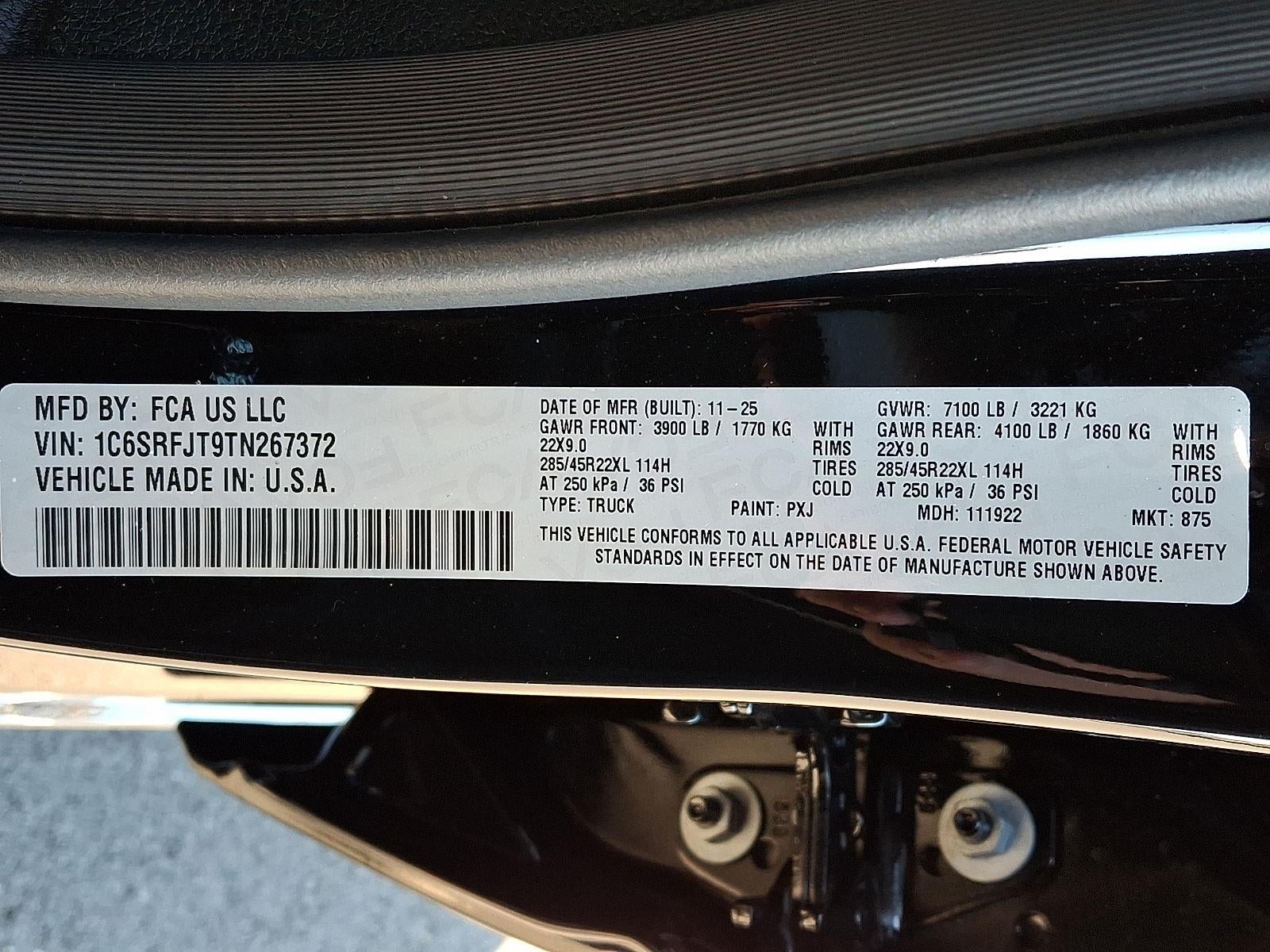 ENGINE: 5.7L V8 HEMI MDS VVT ETORQUE, TRANSMISSION: 8-SPEED AUTOMATIC (8HP75), QUICK ORDER PACKAGE 27H LARAMIE, 3.92 REAR AXLE RATIO, WHEELS: 22"" X 9"" FORGED ALUMINUM, TIRES: 285/45R22XL BSW ALL SEASON, DIAMOND BLACK CRYSTAL PEARLCOAT, BLACK, LEATHER TRIMMED BUCKET SEATS, BED UTILITY GROUP, NIGHT EDITION, LARAMIE LEVEL 1 EQUIPMENT GROUP, ANTI-SPIN DIFFERENTIAL REAR AXLE, TRAILER BRAKE CONTROL, 33 GALLON FUEL TANK, DUAL-PANE PANORAMIC SUNROOF, FRONT LICENSE PLATE BRACKET, MOPAR FRONT & REAR RUBBER FLOOR MATS